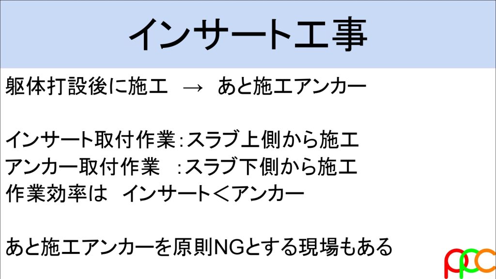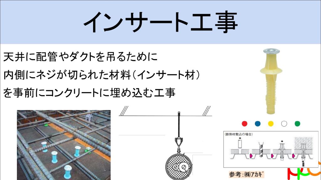 そもそもインサート工事とは、コンクリート打設前にスラブ上から吊り金具を仕込む作業です。