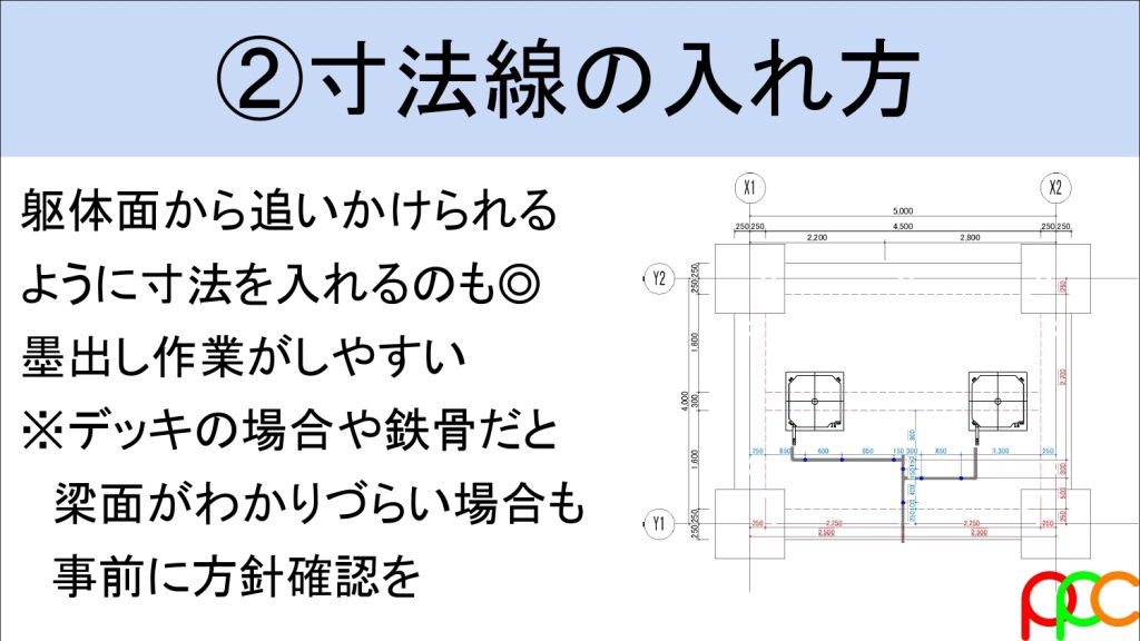- 「梁面(躯体面)」からの追い出し: コンクリート打設前は通り芯が見えません。現地の「梁の面」にメジャーを引っ掛けて追えるよう、梁面からの寸法を入れておくのが現場への最大の思いやりです。