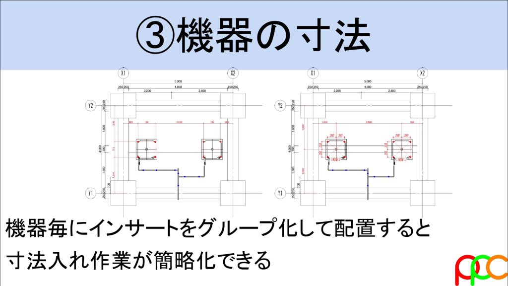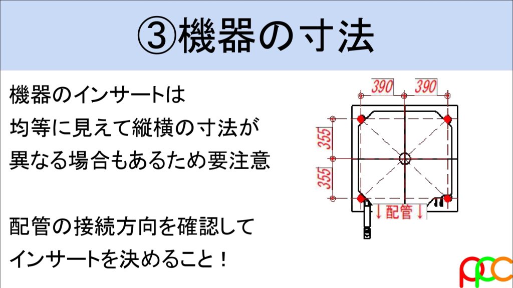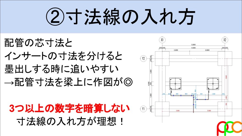 - 「配管芯」を基準にする: 1本の長い寸法線ですべての点を追うのは厳禁。まずは配管ラインの寸法を出し、そこからピッチで追いかけます。