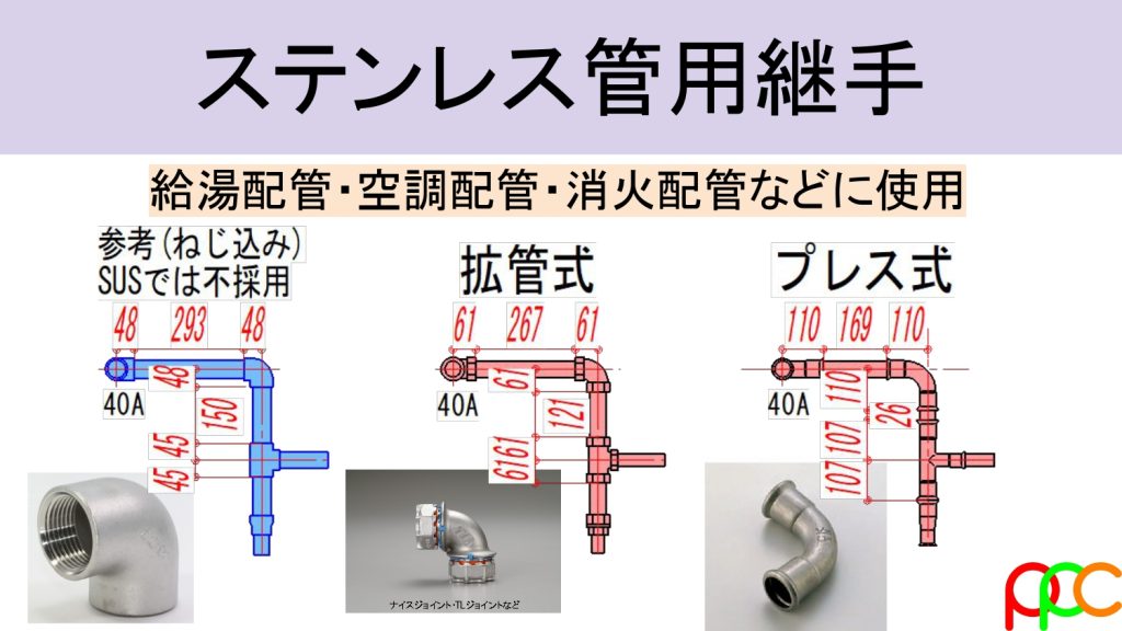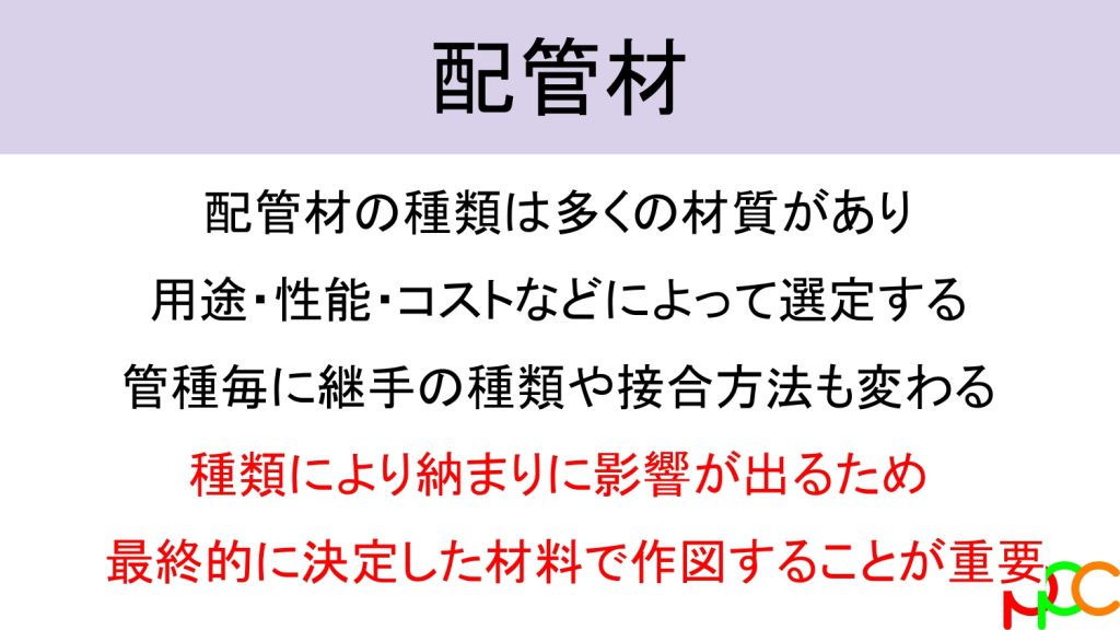 様々な側面から管材を最終的に選定していきますが、特に図面の視点からは納まりにも大きく影響する可能性があるため、決定した管材・継手で作図することが必要になります。