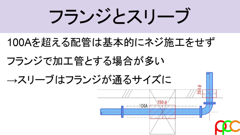 フランジになると基本的に工場加工で施工するのですが、直管部分は両側がフランジの状態で搬入されてくるため、スリーブを通す際にスリーブがフランジよりも小さいと配管を通すことが困難になります。