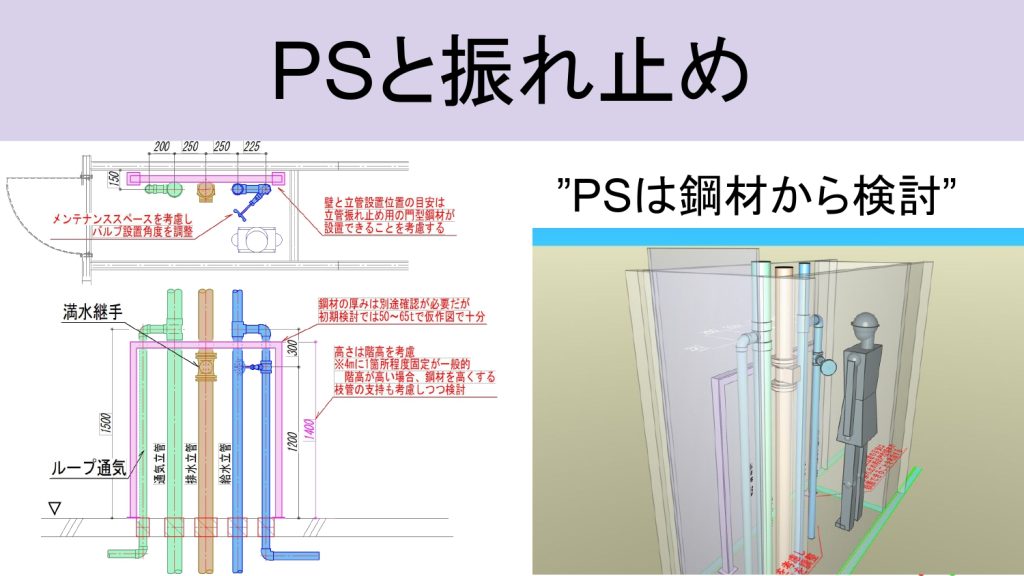 PS立管は床スリーブを検討する上でも必要になるため、初期段階から納まりを確定する必要があります。
