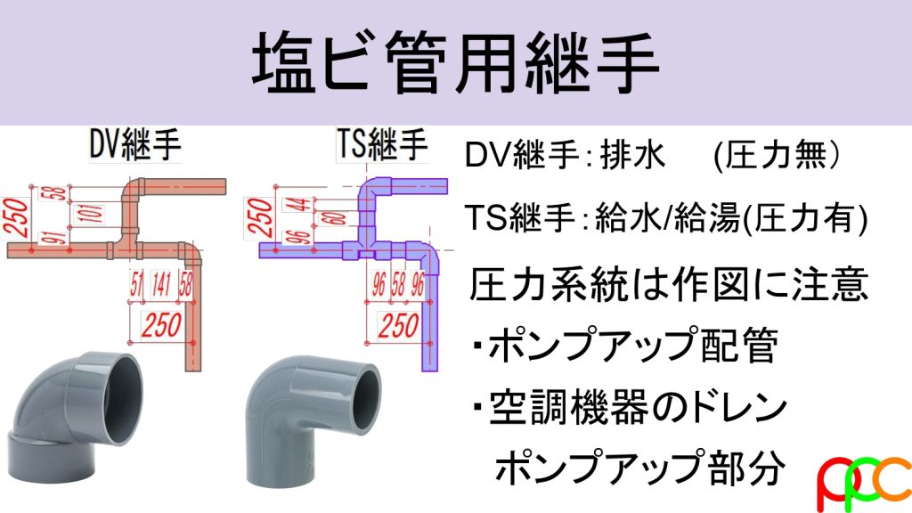 通常の排水用継手がDV継手に対し、圧力用はTS継手を使用します。