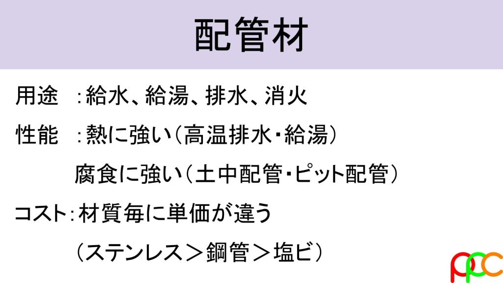 今回は「給排水衛生設備」の配管編として、配管材や継手、施工に関わる共通事項をまとめています。