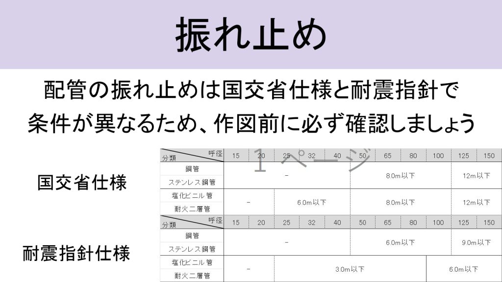 配管振れ止めは国交省と耐震指針で条件が異なります。