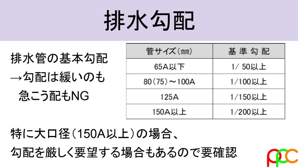 特に枝管など65A以下の細い配管は1/50で検討する必要があります。