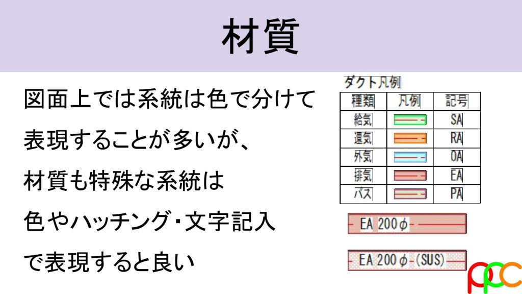 色分けをし過ぎてもわかりづらくなる場合は、そもそも作図系統を仕分けして記号を変更し、ダクト凡例に材質を表現するのも一つの方法です。