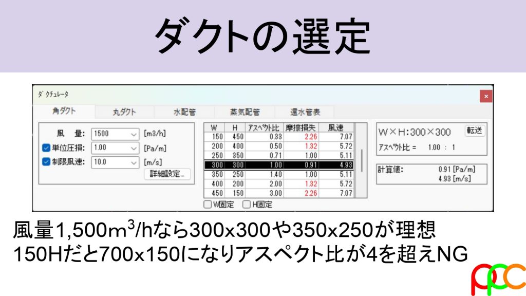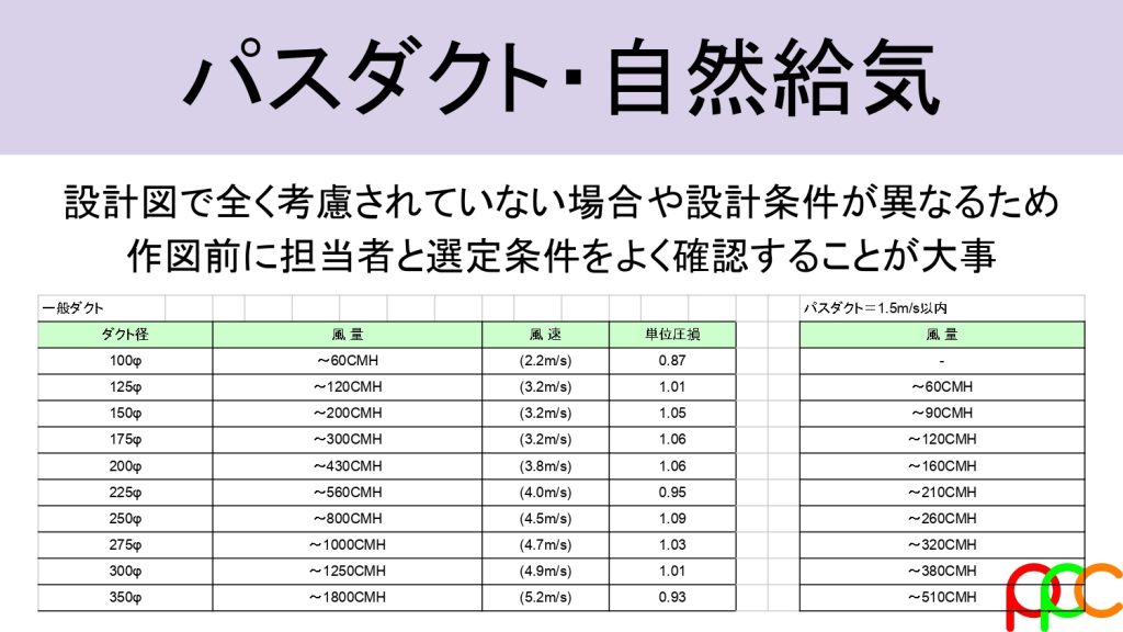 過去のブログで『ダクトサイズ選定の早見表』を記事にしていますので、興味ある方はご参考に。