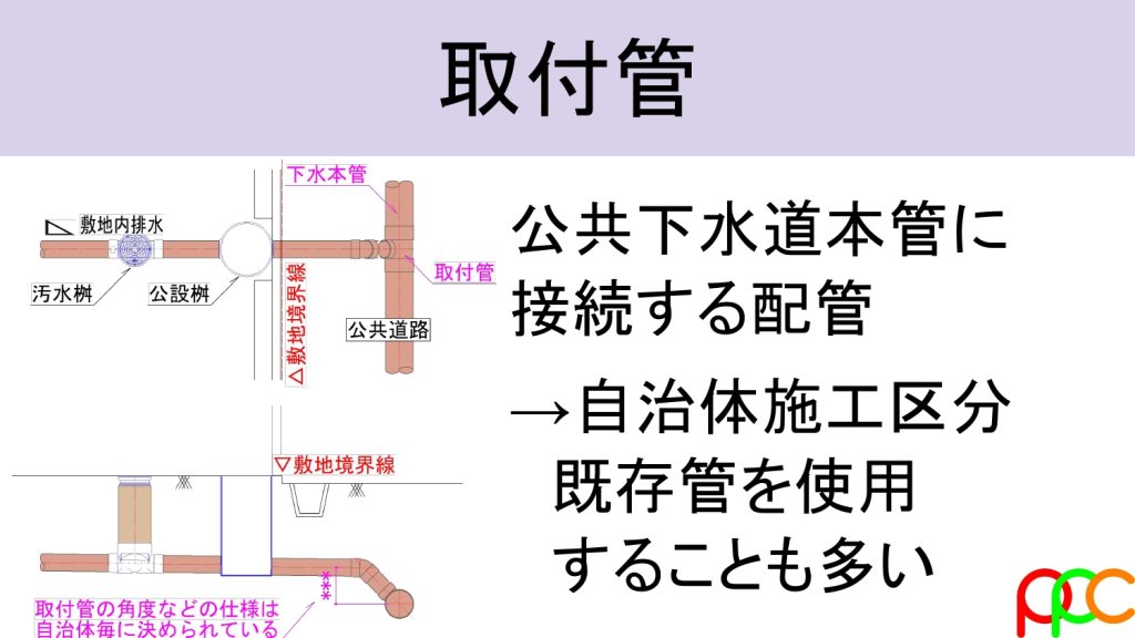 公設桝以降は、下水道本管に配管を接続しますが、配管に直接接続を行う場合は「取付管」を施工する必要があります。