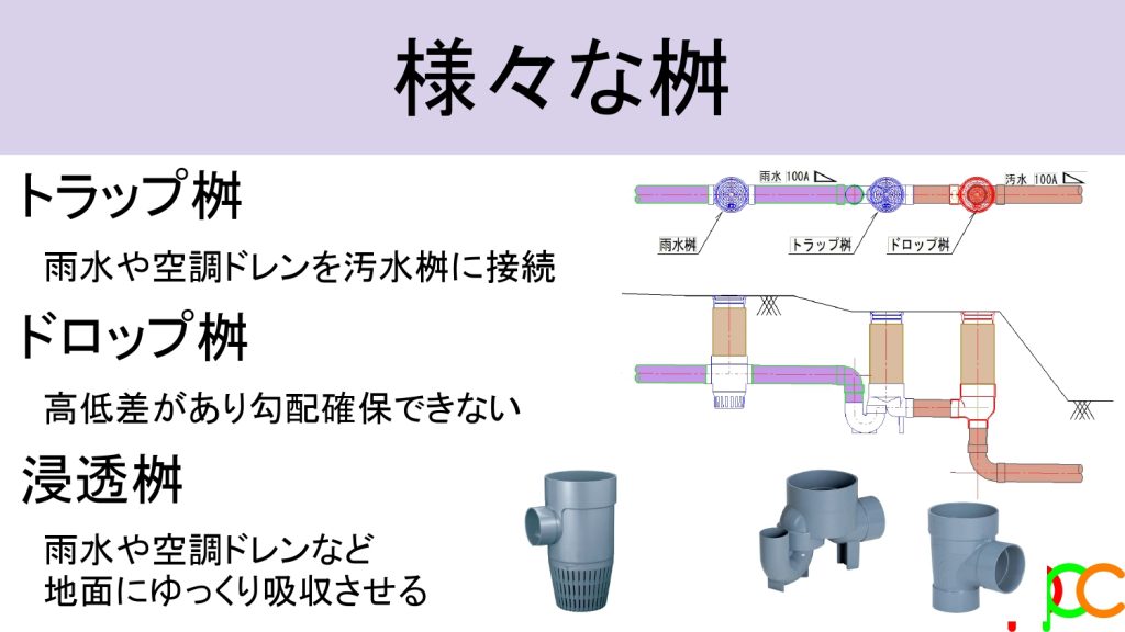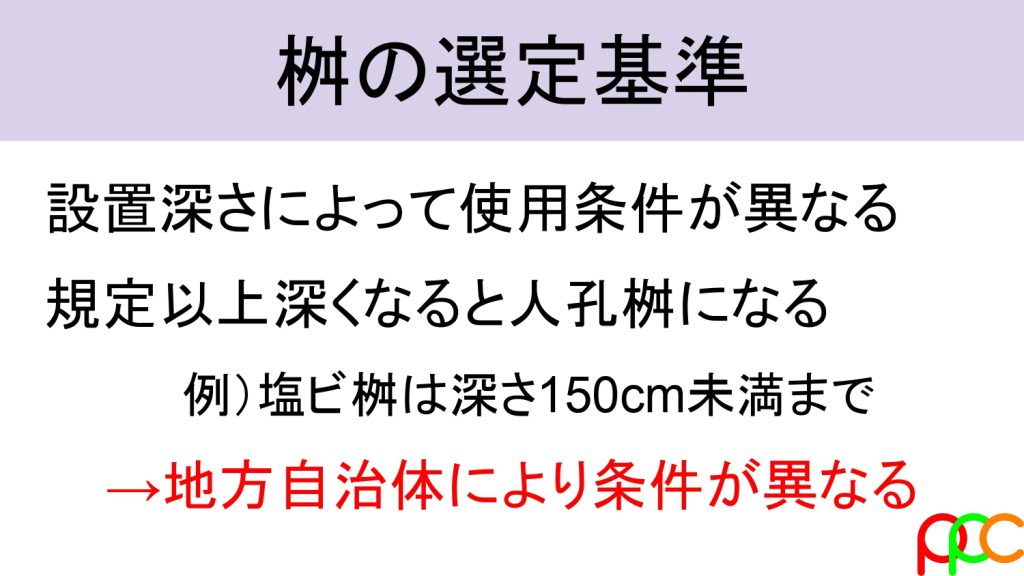 選定条件として桝の設置深さが一つの基準となりますが、1.5m以下を塩ビ桝・それ以上を人孔桝とする場合もあれば、その深さの基準が1.2mや2.0mなど条件が変わります。