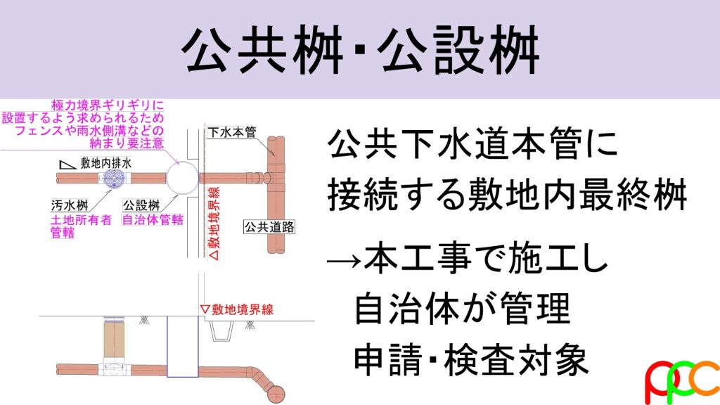 特に公桝は設置位置が敷地境界から離れてしまうと、それだけ公共配管が宅地内に入ってしまうため、敷地境界線ギリギリに設置するように求められます。