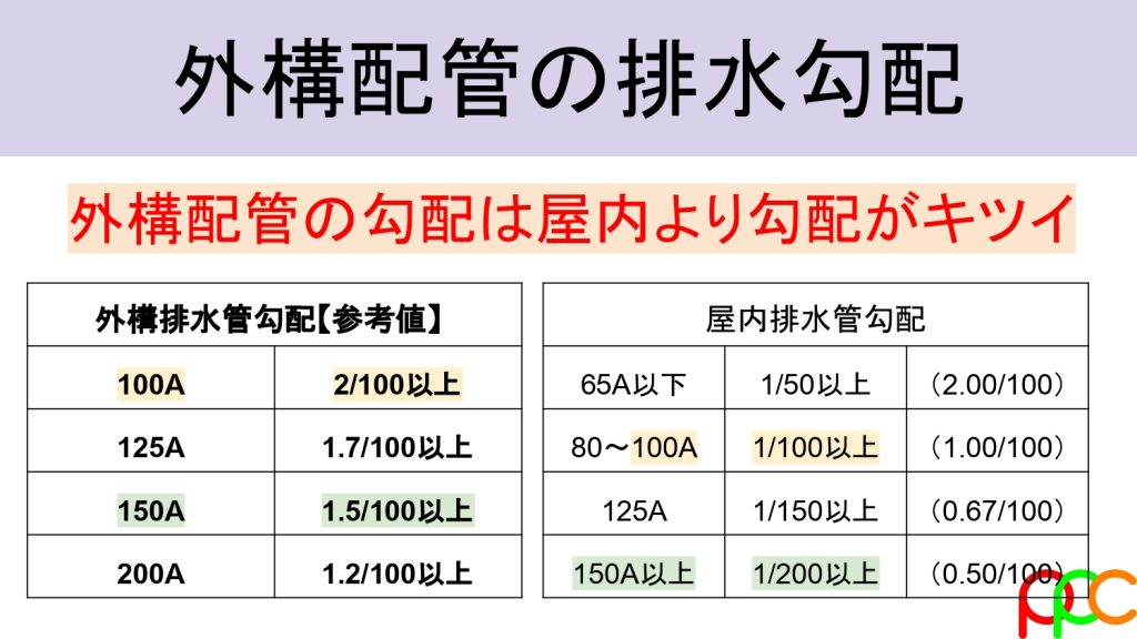 一般的に屋内排水管よりも外構排水管の方が勾配を厳しく選定する場合があります。