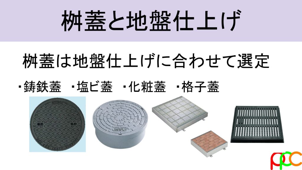 蓋の仕様はその設置する場所の地盤仕上げ材によって異なるため、建築の仕上げ図を把握することが必須です。