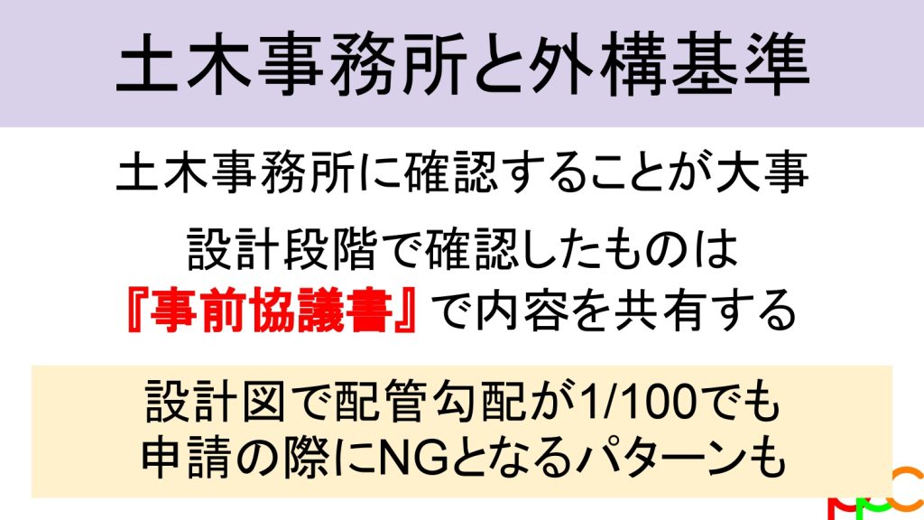 特に設計図では1/100で勾配検討していた場合でも、土木事務所に確認をしたら一般的な厳しい条件の勾配を求められ変更となる場合も多く見てきました。
