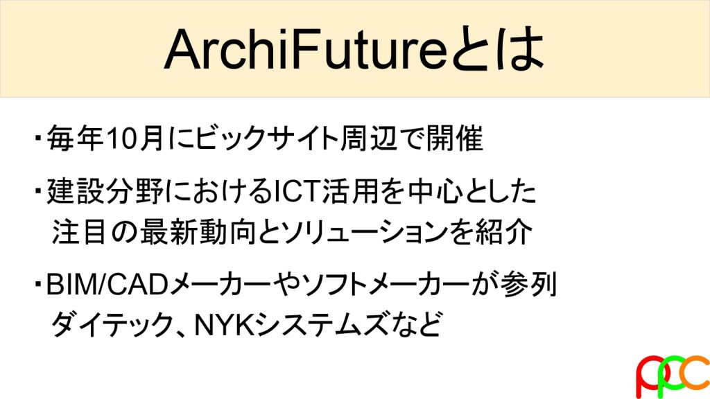 毎年行われているこのイベントは、建設業界のICT技術や最新ソリューションを紹介する行事で、特にCADやBIMのメーカーが集まり新規リリース情報や最新機能紹介などを行うため、普段3D-CADを扱う立場の方は一度に多くの最新情報情報を仕入れられる絶好の機会です。