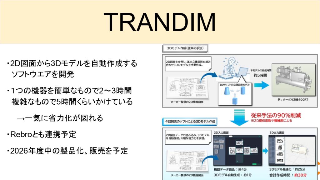 TRANDIMで作成した3DモデルをRebroと連携し取り込めるように開発を進めているとのことで、2026年度中には正式に製品化し一般販売を予定しているとのことでした。