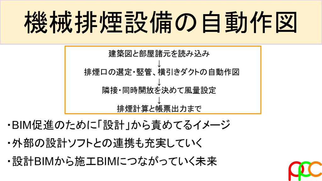 また、三機工業社と共同開発を進めていることで、現在は機械排煙設備の自動計算・作図の機能を作成しており、今後も合理化を進めてレブロ機能向上を行っていくとのことです。