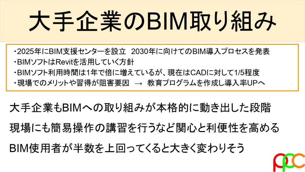 個人的には支援センター発足がまだ今年の段階ということに正直驚きました。勝手ながら、最大手会社はすでにBIMが半分以上普及していて、すでに仕組化がほぼ完了しているくらいの取り組みがされているのだと無知の中で想像してしまっていました。