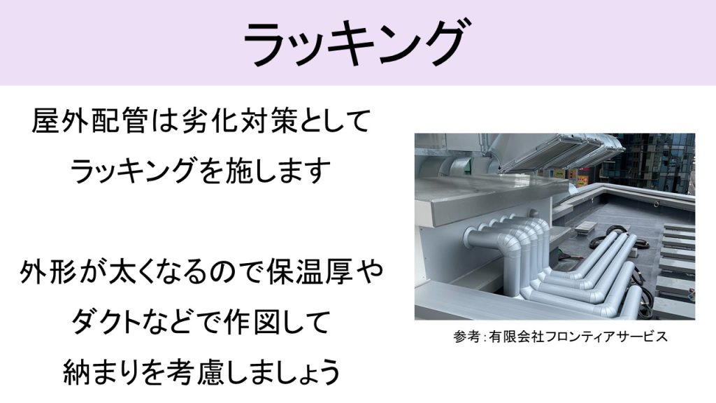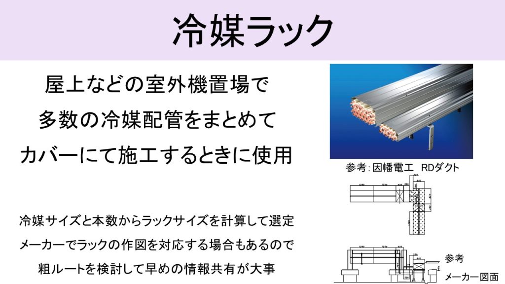 特に冷媒ラックは電気ラックとの取り合いなども生じてくるため、採用の現場は早めに電気図面と調整し協議することが大切です。