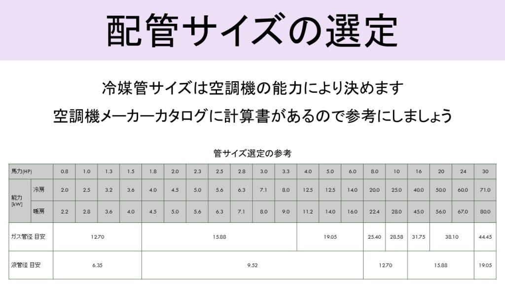 ただし、後半にも出てきますが配管の長さによってもサイズの選定条件が変わってきます。