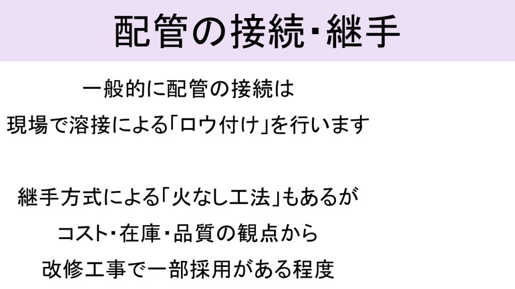 火なし工法は安全面からも注目度が高いですが、実際に職人さんに聞いたところ、中規模の新築現場はまだロウ付け施工が大半と言っていました。