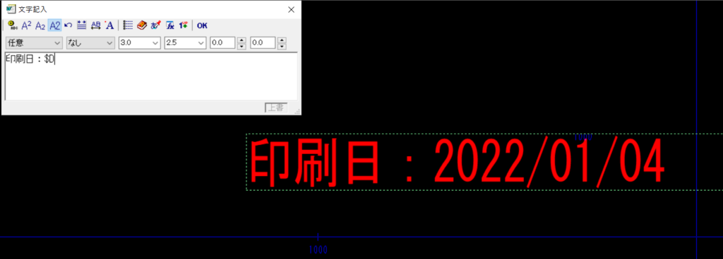 また、文字列は文字の途中に入れても機能するので、『印刷日:$D』と入力すると下記のように表示されます。
