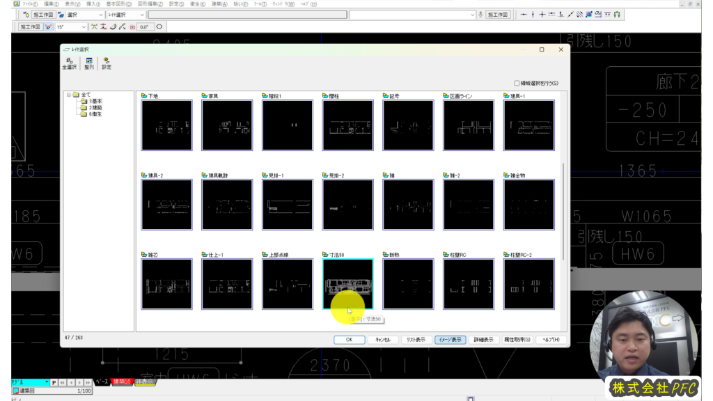 例えば、平面図上の寸法線を選択すると、寸法線の入ったレイヤが選択され、そのままOKでそのレイヤ内のデータをすべて「選択状態」にすることが可能となります。