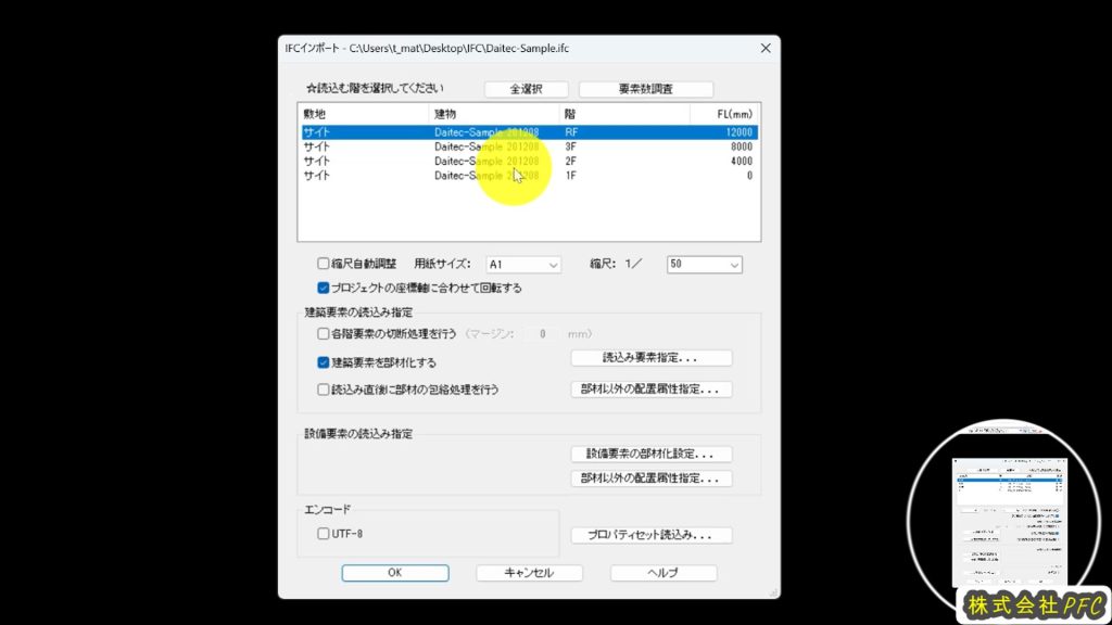 IFCデータを開くと「IFCインポート」画面が表示されます。