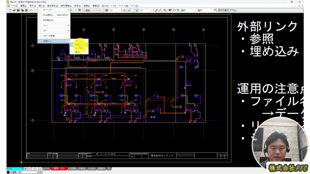よく利用されるのが建築の平面図や図面枠データなど、複数の図面で共通して活用するデータに外部リンク機能を使用することで、更新作業が生じた場合にリンク元データを更新することで複数データに同時に反映することができる機能になります。