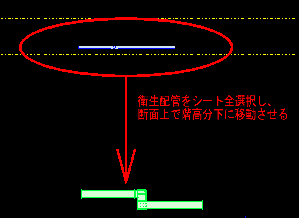 あとは、衛生配管を全選択し断面表示し、断面図上ですべて選択して階高分下に移動してください。