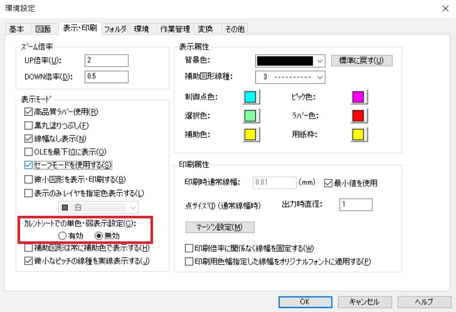 「表示モード」の下の方に「カレントシートでの単色・弱表示設定 有効/無効」があります。