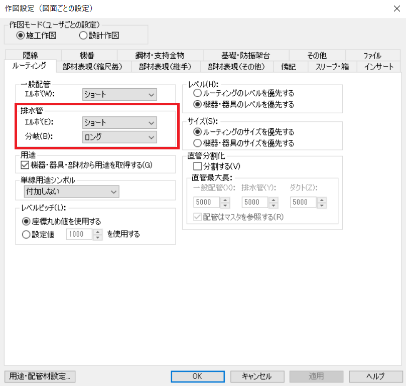 『空調/衛生→作図設定』を開き、「ルーティング」のタブを選択します。