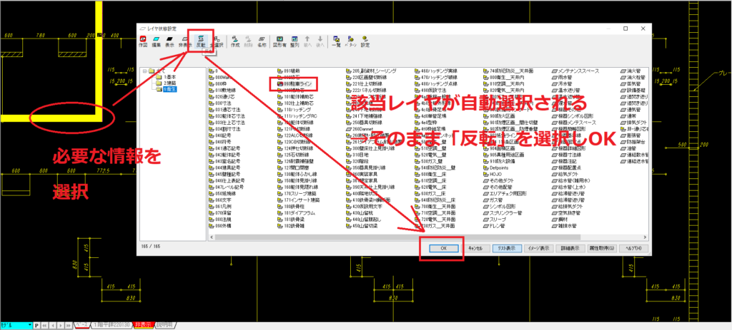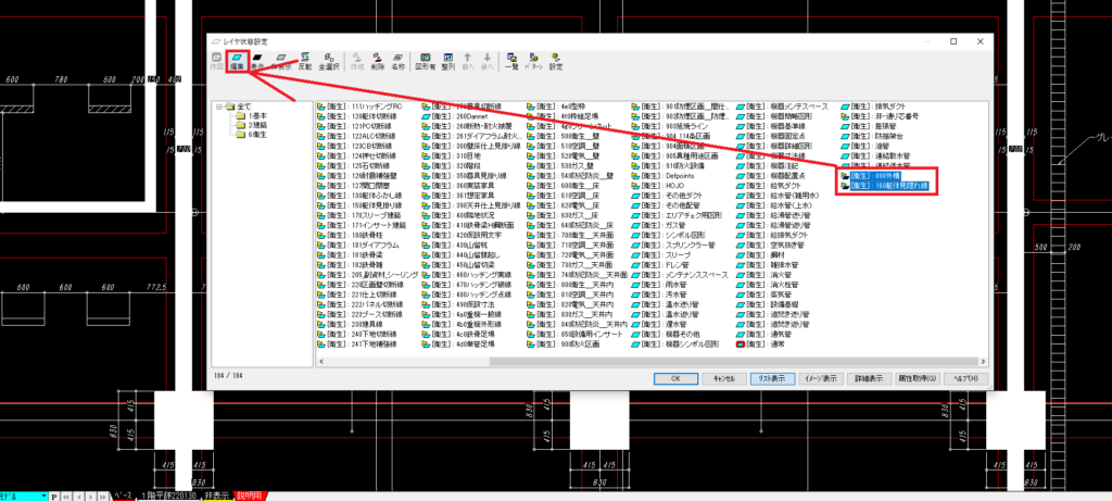 建築図面は相当ダメな図面でない限り、そこそこレイヤ管理がされているので、不要なデータをレイヤ選択し「非表示」シートに移動していきます。