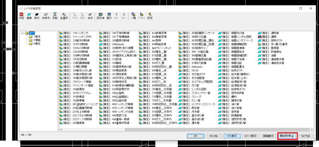 「属性取得」を選択し、平面図上で非表示にしたい情報をクリックします。すると該当レイヤが自動選択されるので、そのままOKを選択すると該当レイヤを一括選択できます。