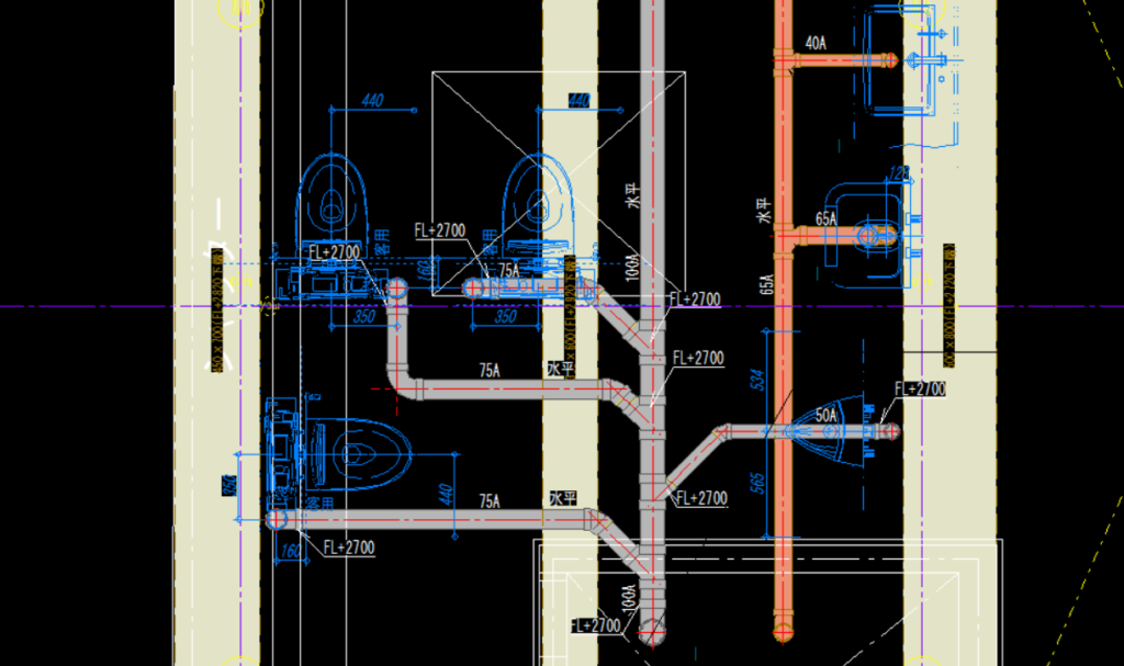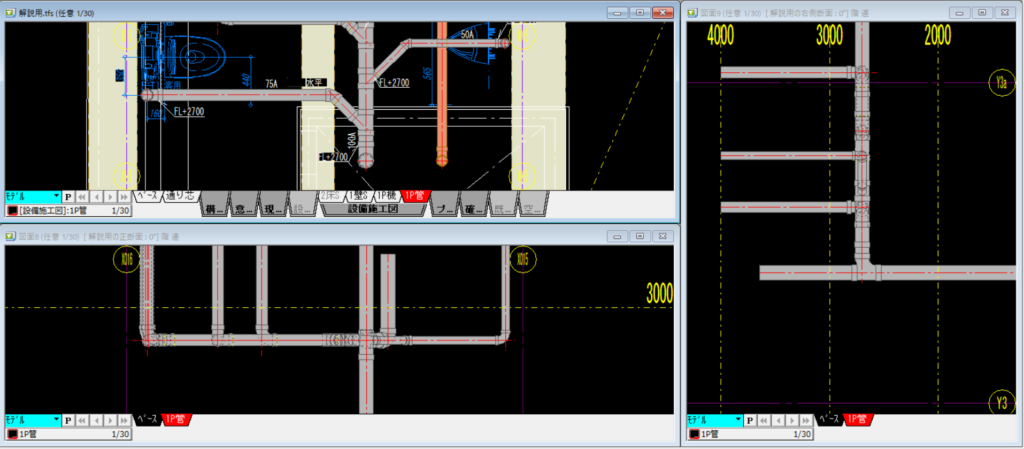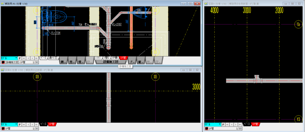 例えばこんな感じで配管が一通り作図完了している状態で、排水管に勾配を設定します。