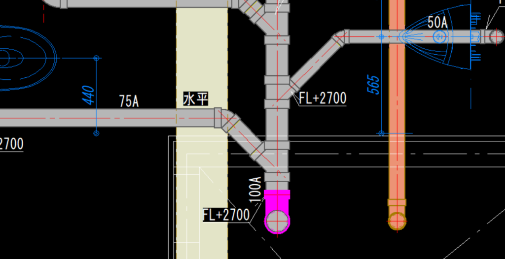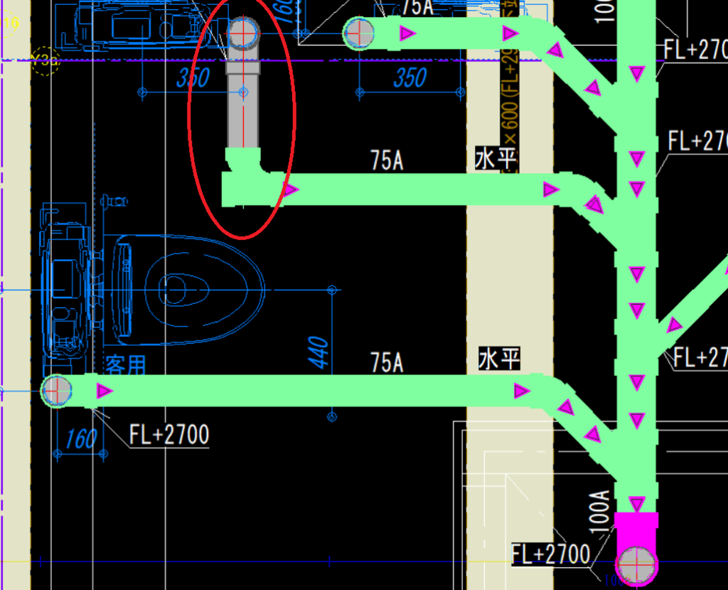 この場合、施工時にはエルボか掃除口を設けるので、作図上も掃除口を設けることで勾配漏れにならないので注意しましょう。