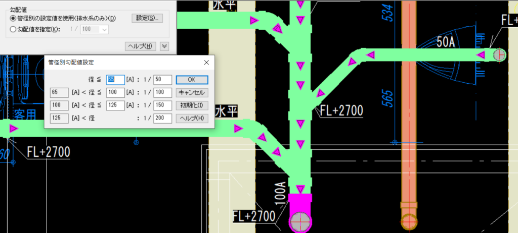 「管径別の設定値を使用(排水系のみ)」では、「設定」で登録された管径毎の勾配値が自動作図されます。