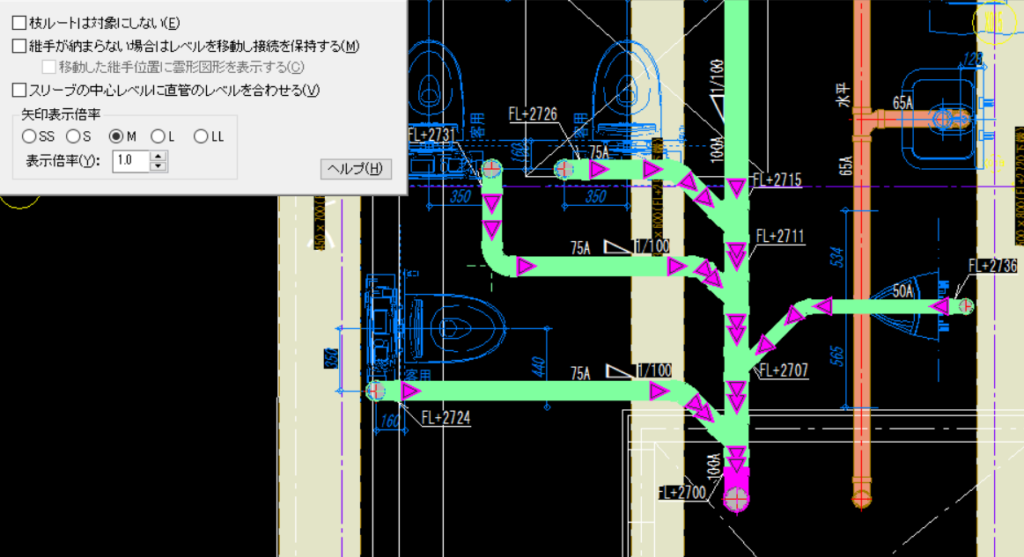 最初に設定することで、エルボや分岐などの配管にも勾配が自動作図されていくので納まりをイメージしながら作図することができます。