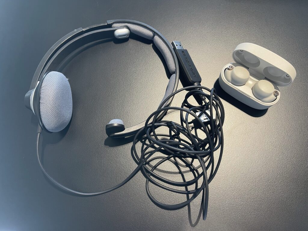 家では両耳のヘッドホンでもいいですが、外では自分の声のヴォリュームもわかるので片耳タイプがオススメです。
