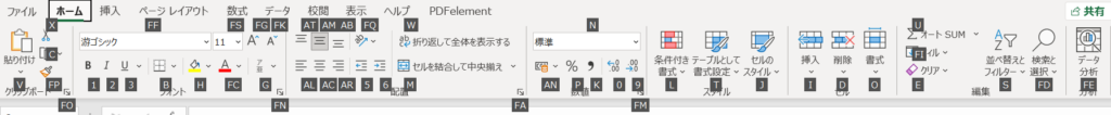 画面上でALTキーを少し長押しすると、メニューバーの各コマンドに割り振られたキーが表示されます。