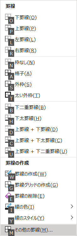 例えば罫線だけでも「ALT→H→B→〇」ですべての条件が割り振られるため、連続して同じような作業をしている時はその場だけ覚えて作業すると便利です。