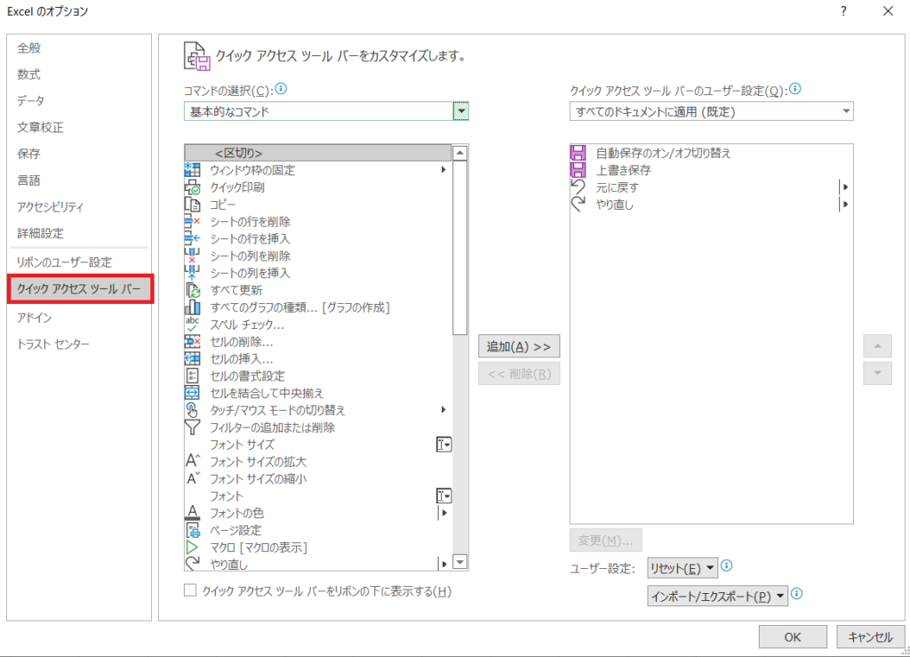 画面の右側には、現在先ほどツールバー左上に表示されている「クイックツールバー」のメニューがリストとして表示されます。