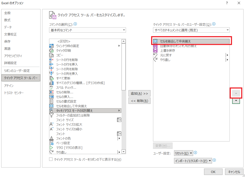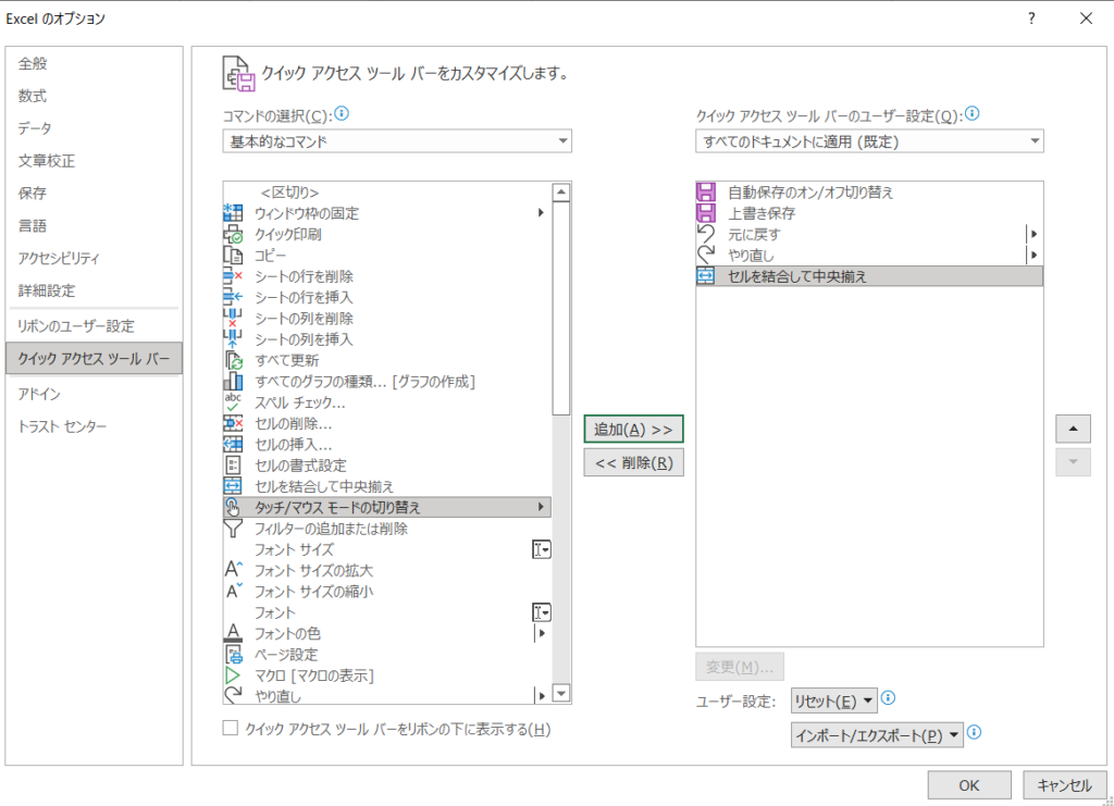 例えば私は「セルの結合」を頻繁に使用するので、「セルを結合して中央揃え」のコマンドを選択し追加します。