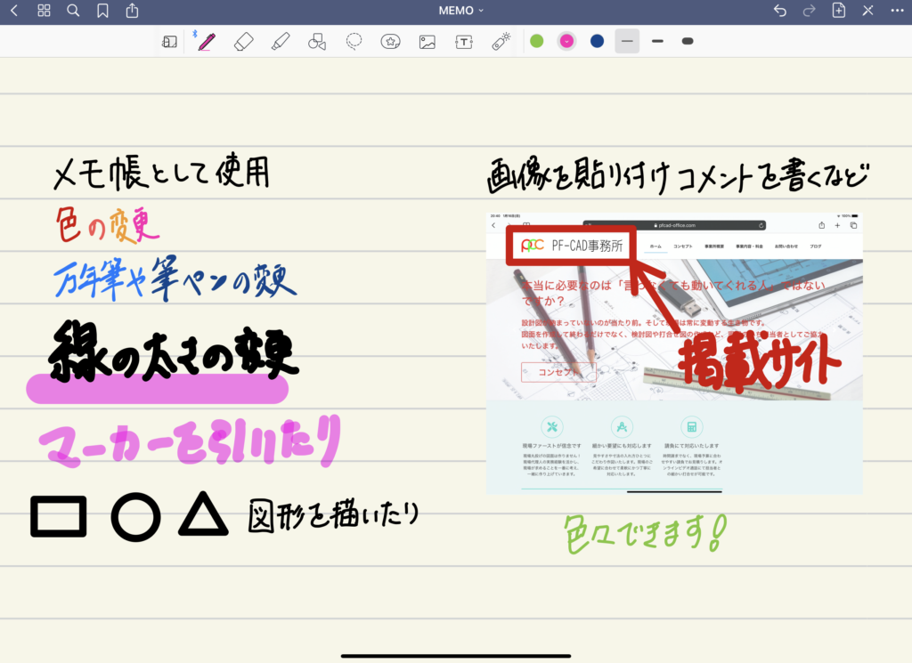 画像の貼り付けも簡単にできるので、撮った写真にコメントなどを残せます。