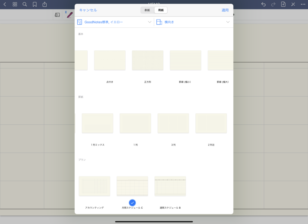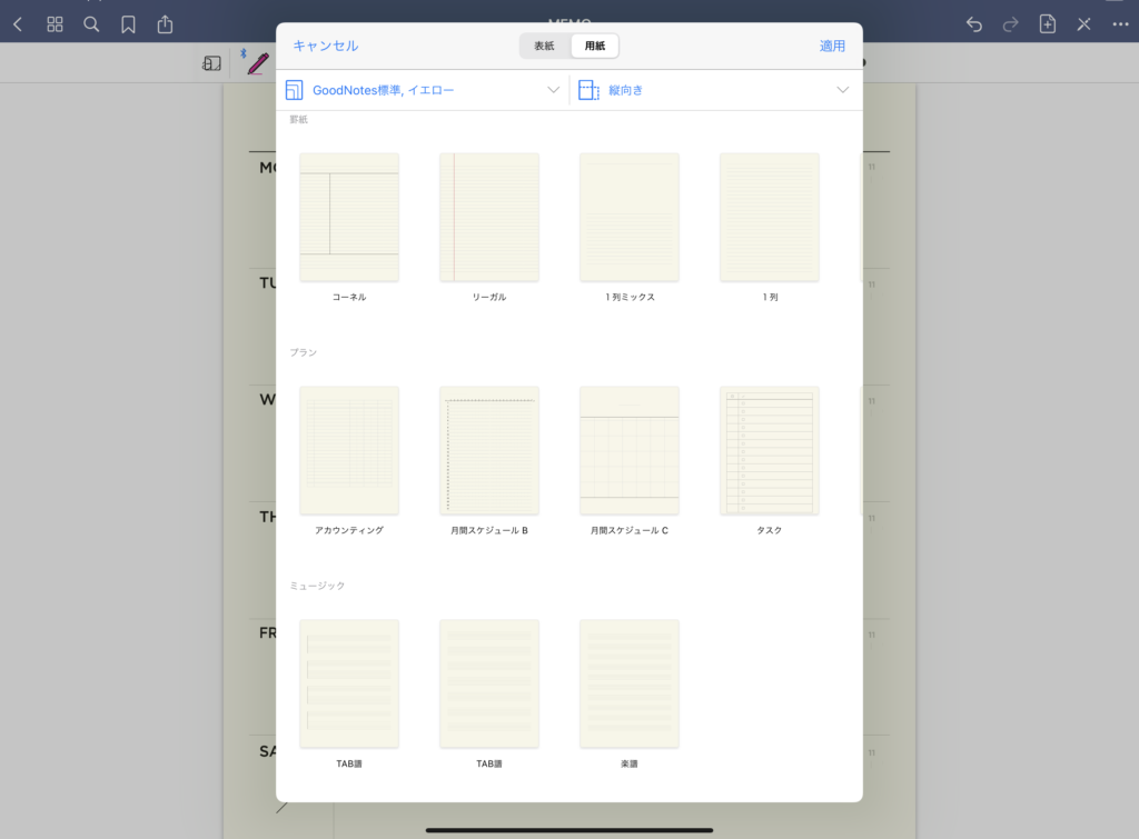 ページには様々なテンプレートがあり、横線・マス目、週間スケジュール・月間スケジュールに音楽用のTAB譜まであります。